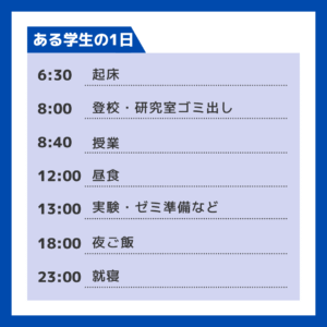 ここからは、コアタイムや日々のスケジュールを中心に研究室での1日がどのようなものかをイメージしやすくご紹介していきます。